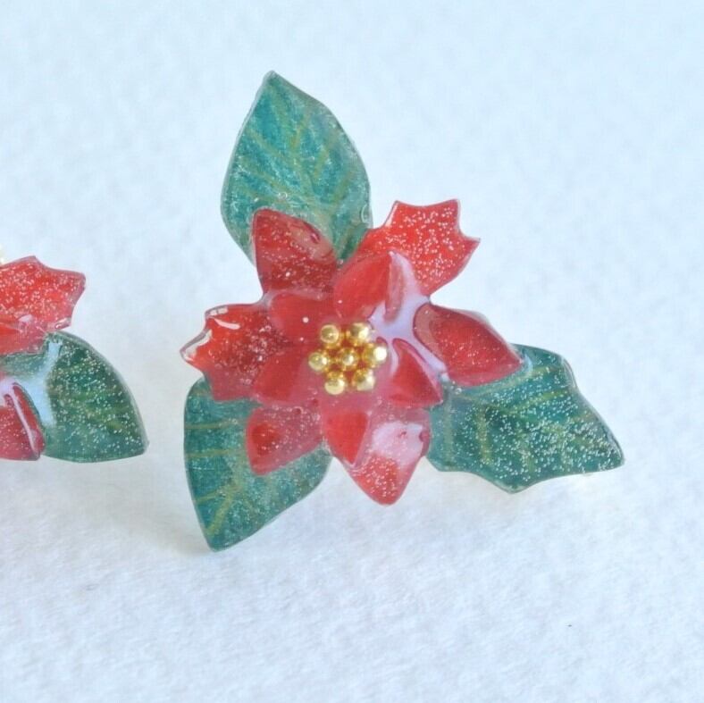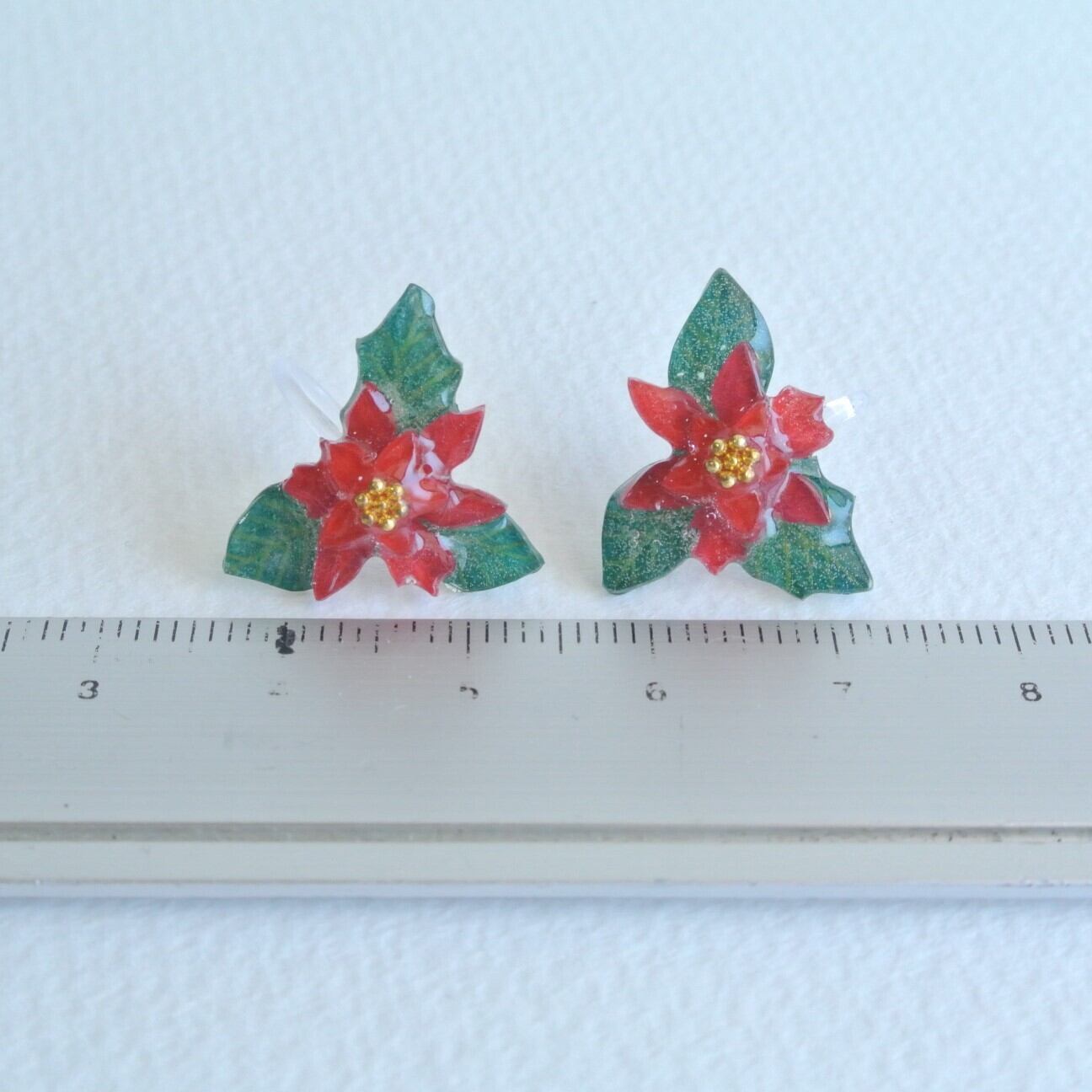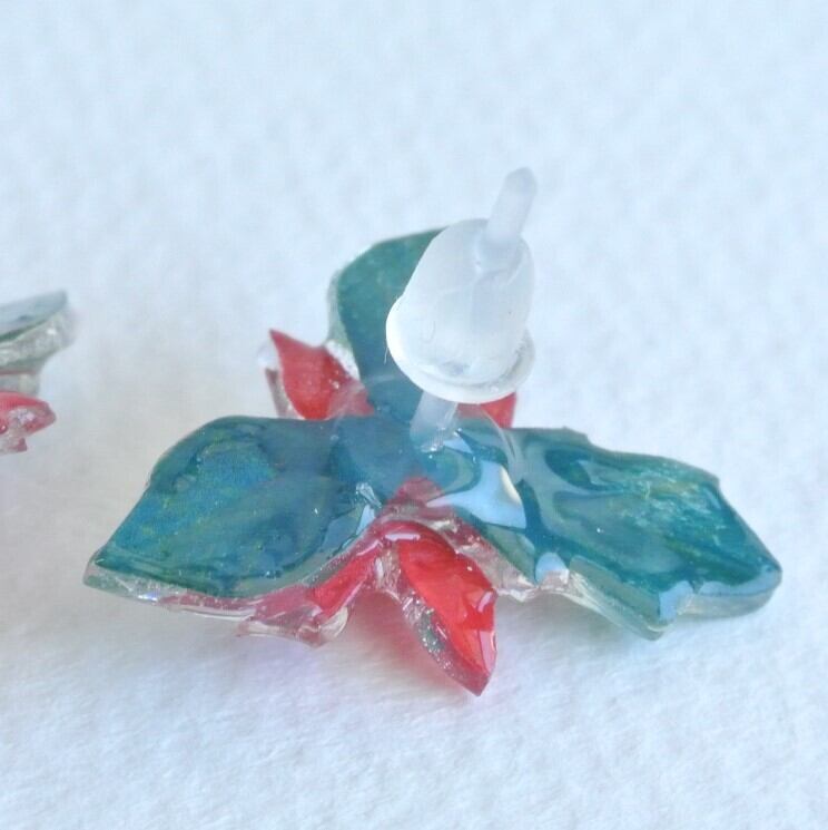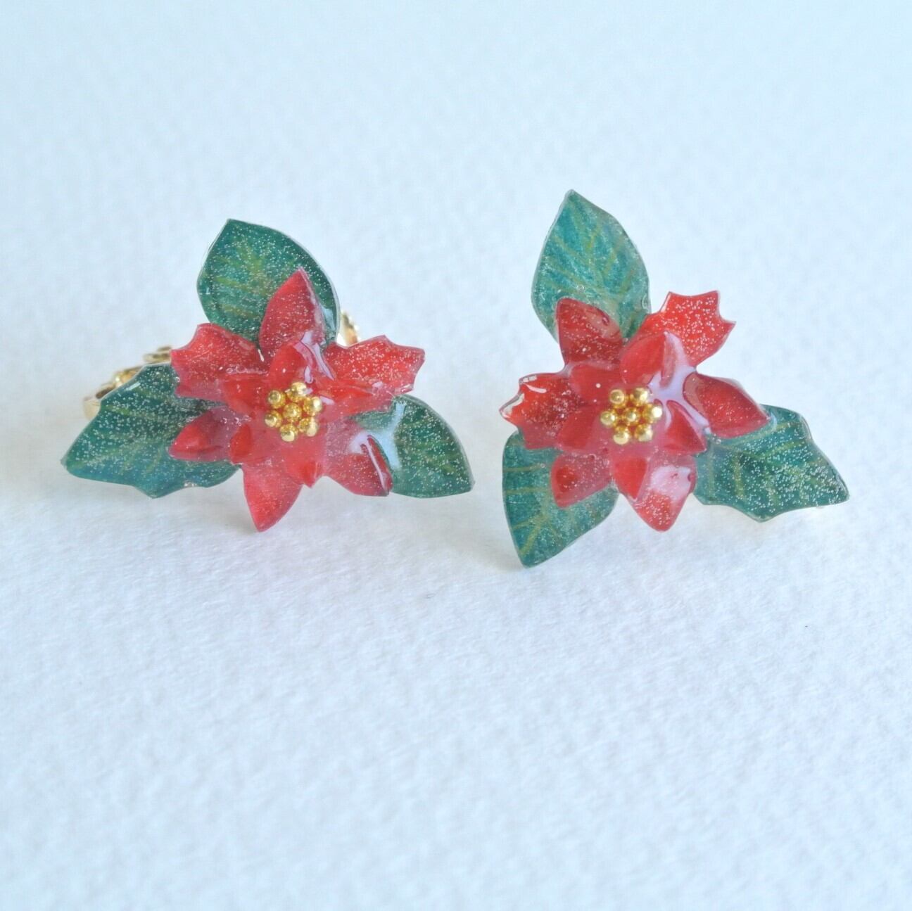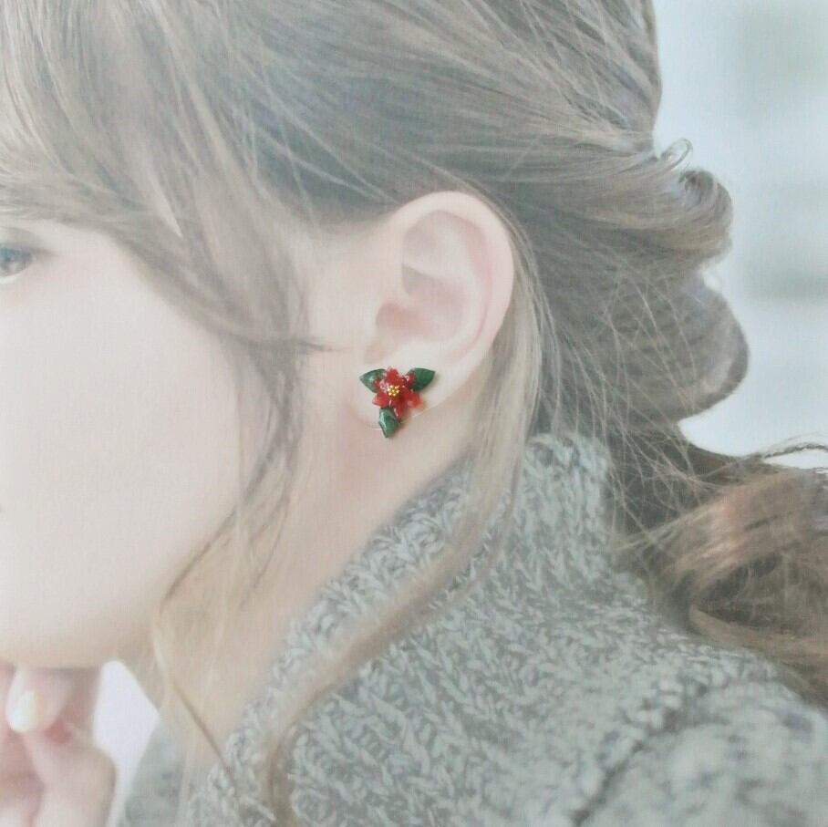 クリスマスには欠かせないポインセチアを耳飾りにしました。深い赤と緑のコントラストが目を惹く商品です。少し大きめですが重さもほとんど感じずにお使いいただけます。モチーフ部分はプラバンに色鉛筆で手描きしており、手作業でパーツの状態にしたのち、ひとつひとつ組み立て、レジンでコーティングして形を作っております。お色は二枚目の画像が実物に近いです。